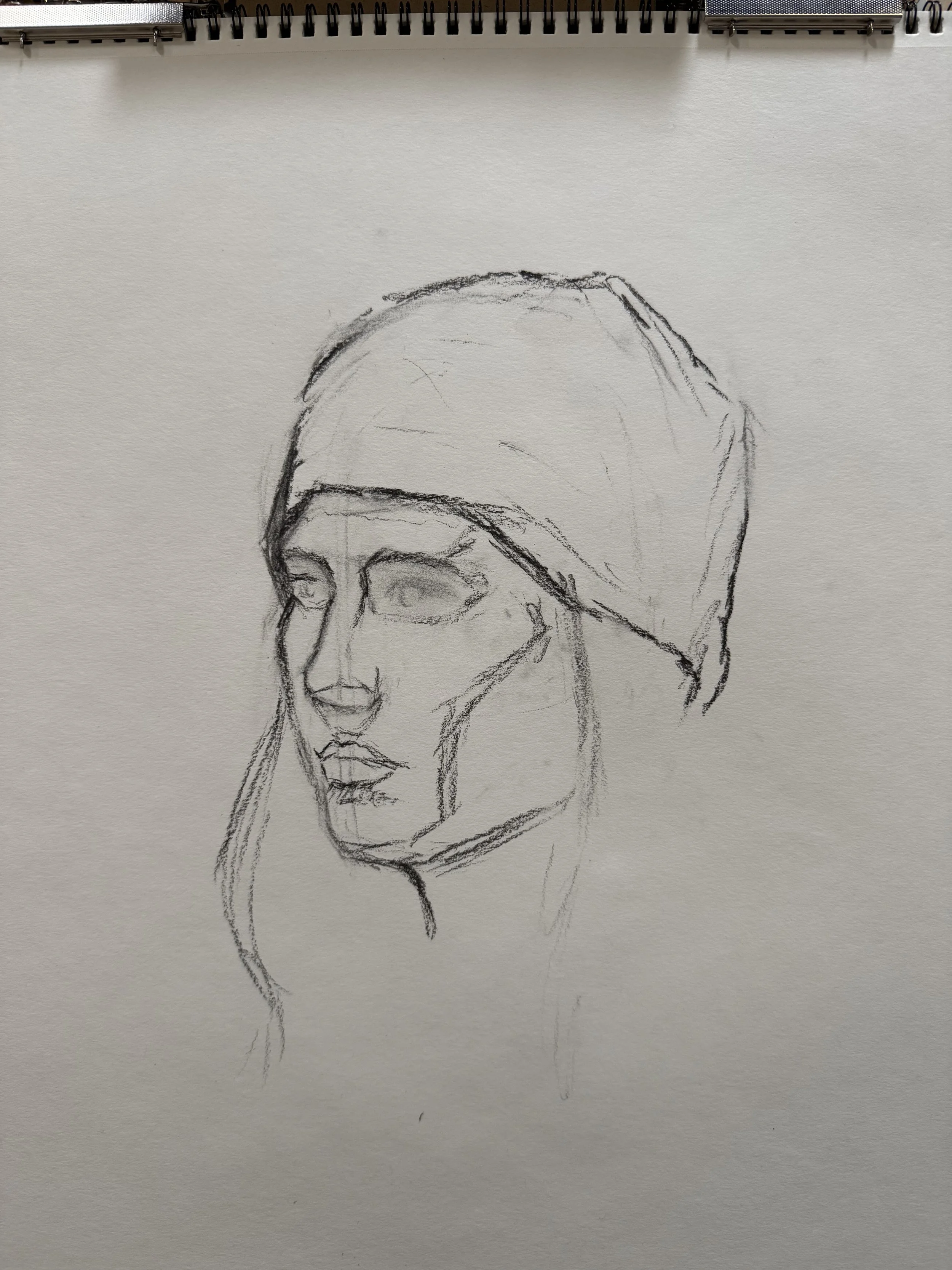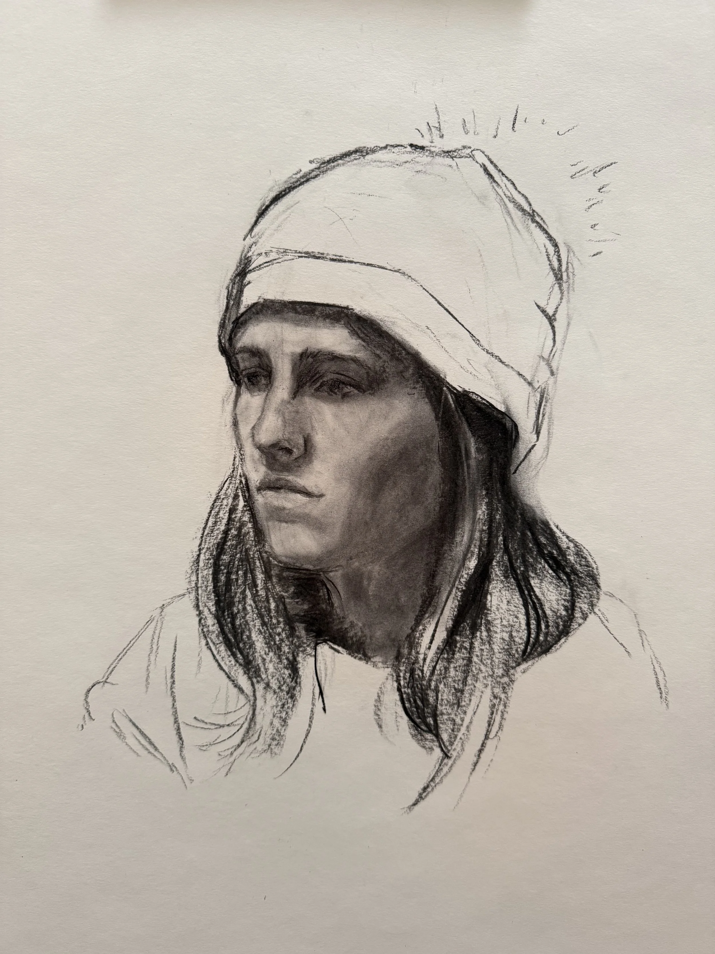 Despite this starting as an uncomfortable experience during the first session, there is a certain rush to working from a live model surrounded by your peers. Feeling that everyone around you is also singularly focused on capturing the likeness of the model. Knowing that the clock is ticking, and you have only so much time to make a simple statement with your drawing. I walked out of our first drawing session feeling absolutely exhausted and not satisfied with my first drawing, yet I was ready and excited to continue practicing. I knew the deficiencies I saw in my first attempt could be fixed over time with focused practice.