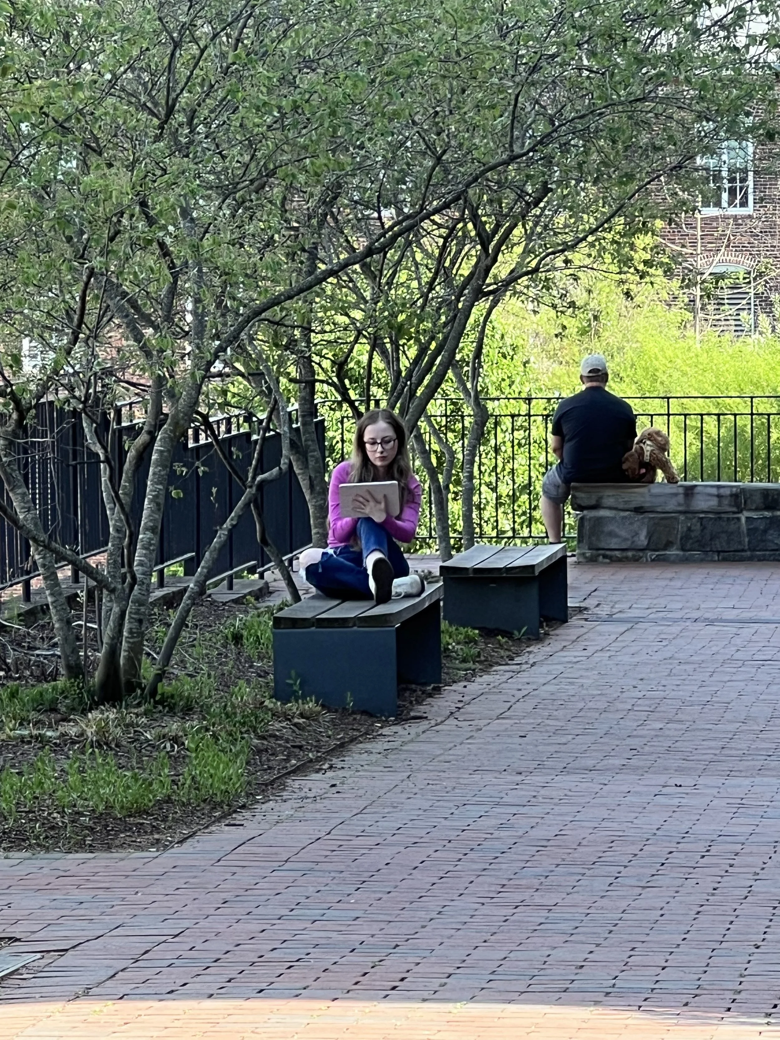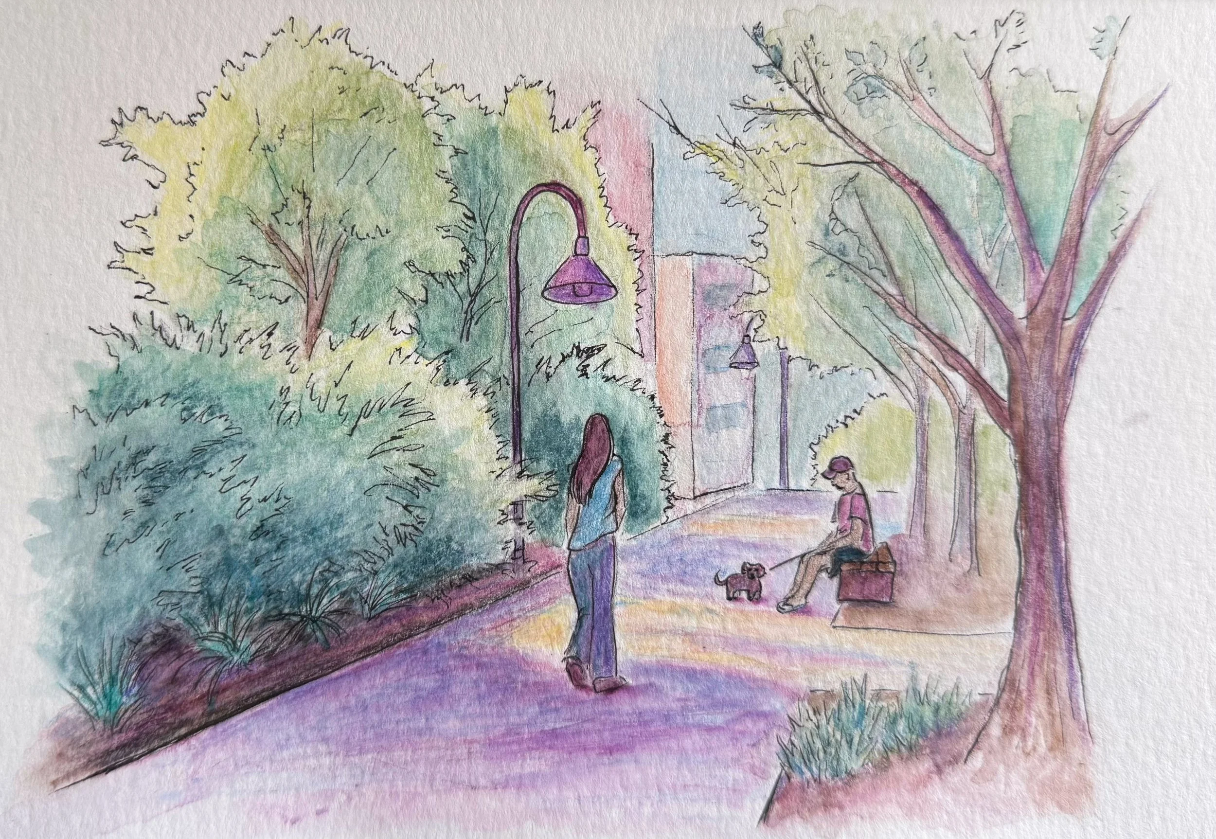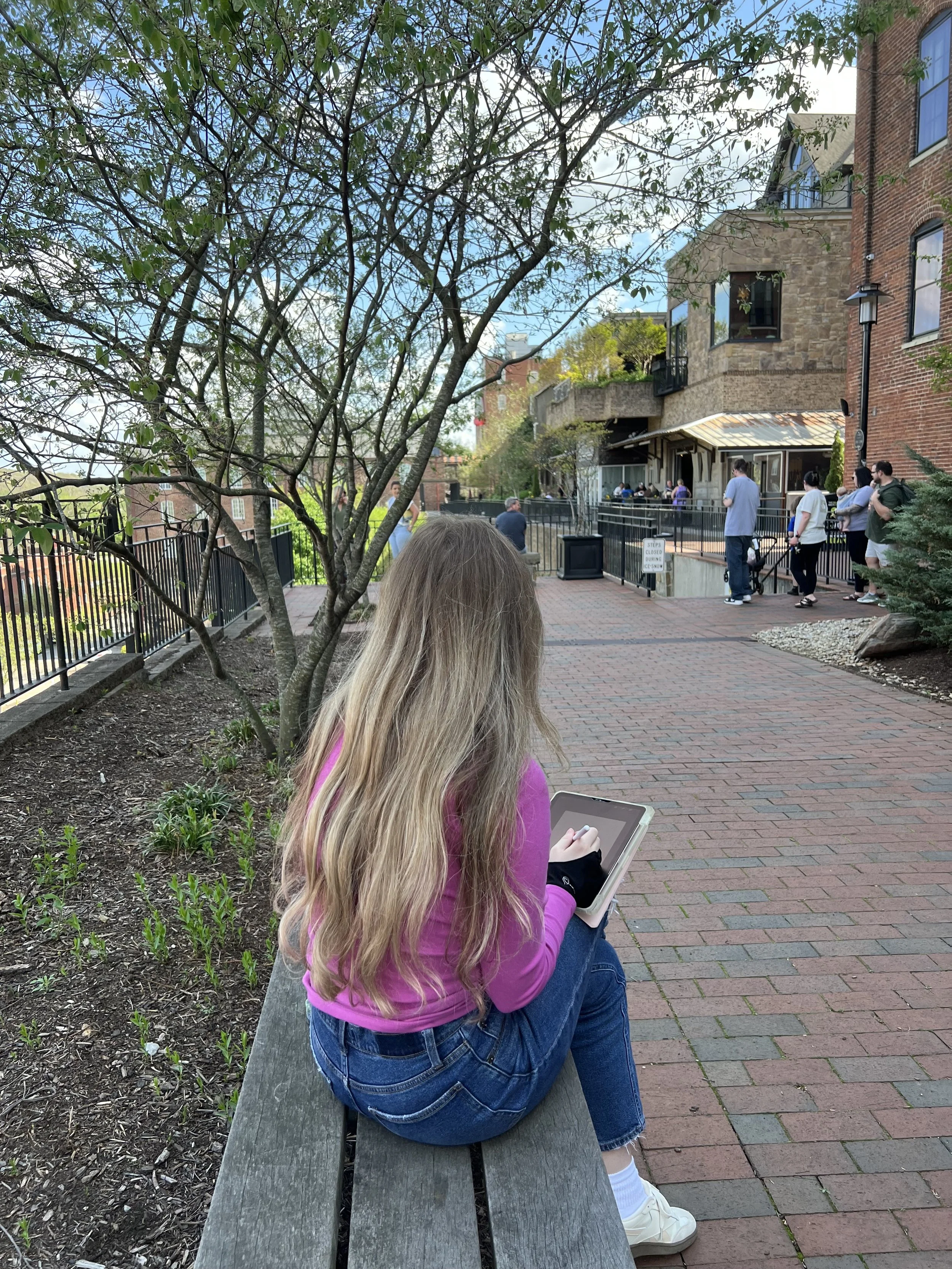 For the second scene, I sat on a bench in downtown Lynchburg. Once again, I thought this sketch would be digital, so I started on my iPad. However, I ultimately decided to try out a new medium: watercolor pencils.