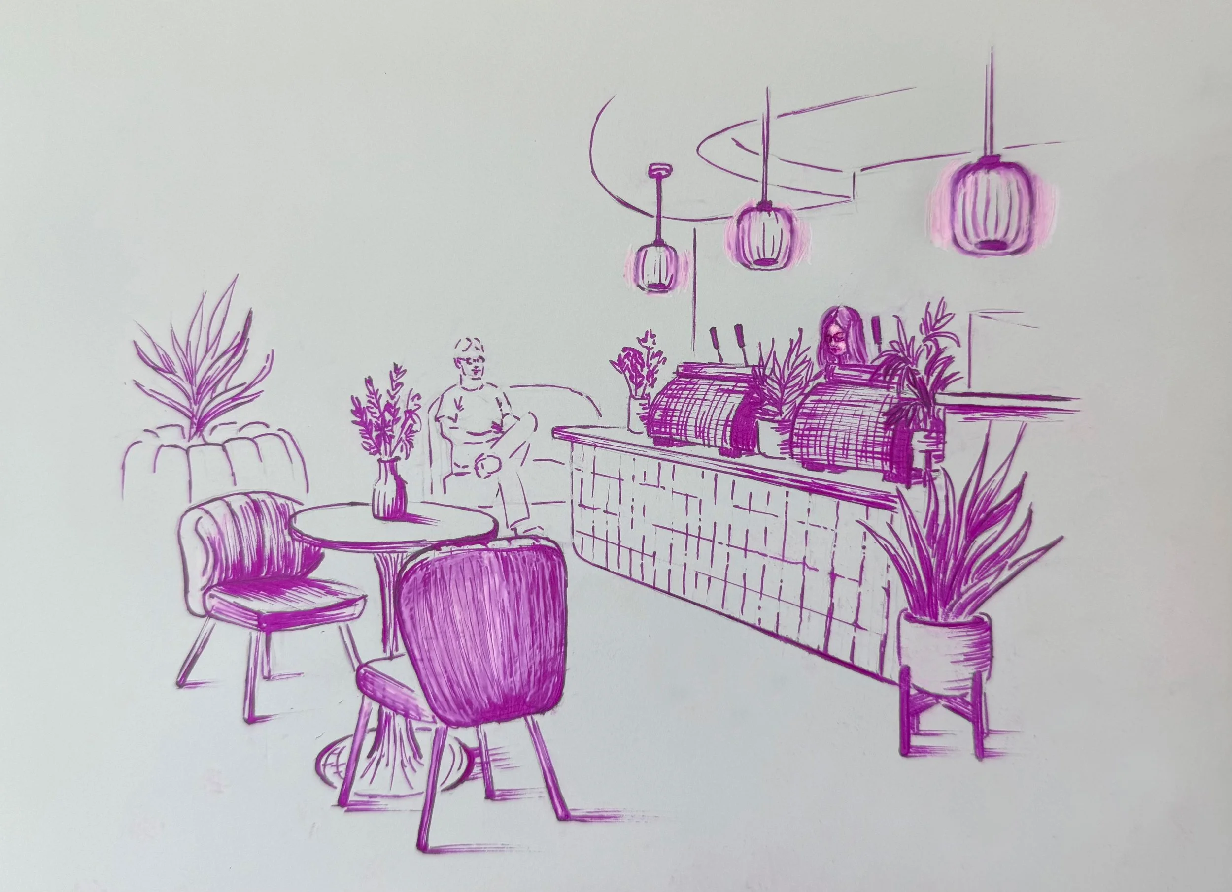 At first, I thought I’d do fully digital for this first one, but I switched mediums halfway through. After the initial digital sketch, I tried pen & ink. I still wanted to work with color, so I decided to use magenta ink instead.