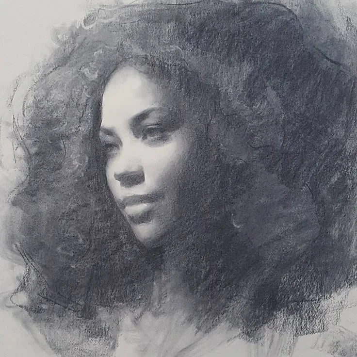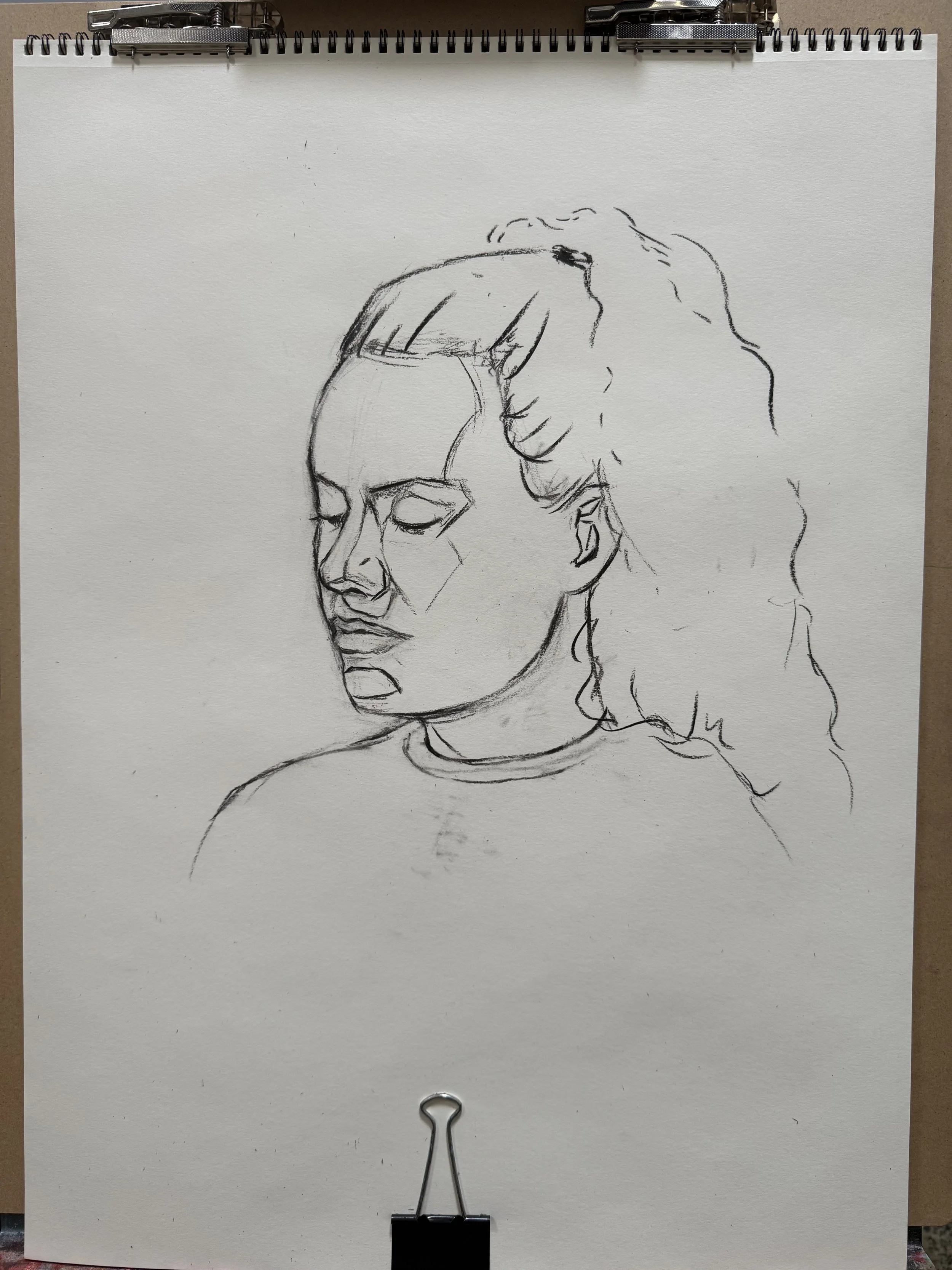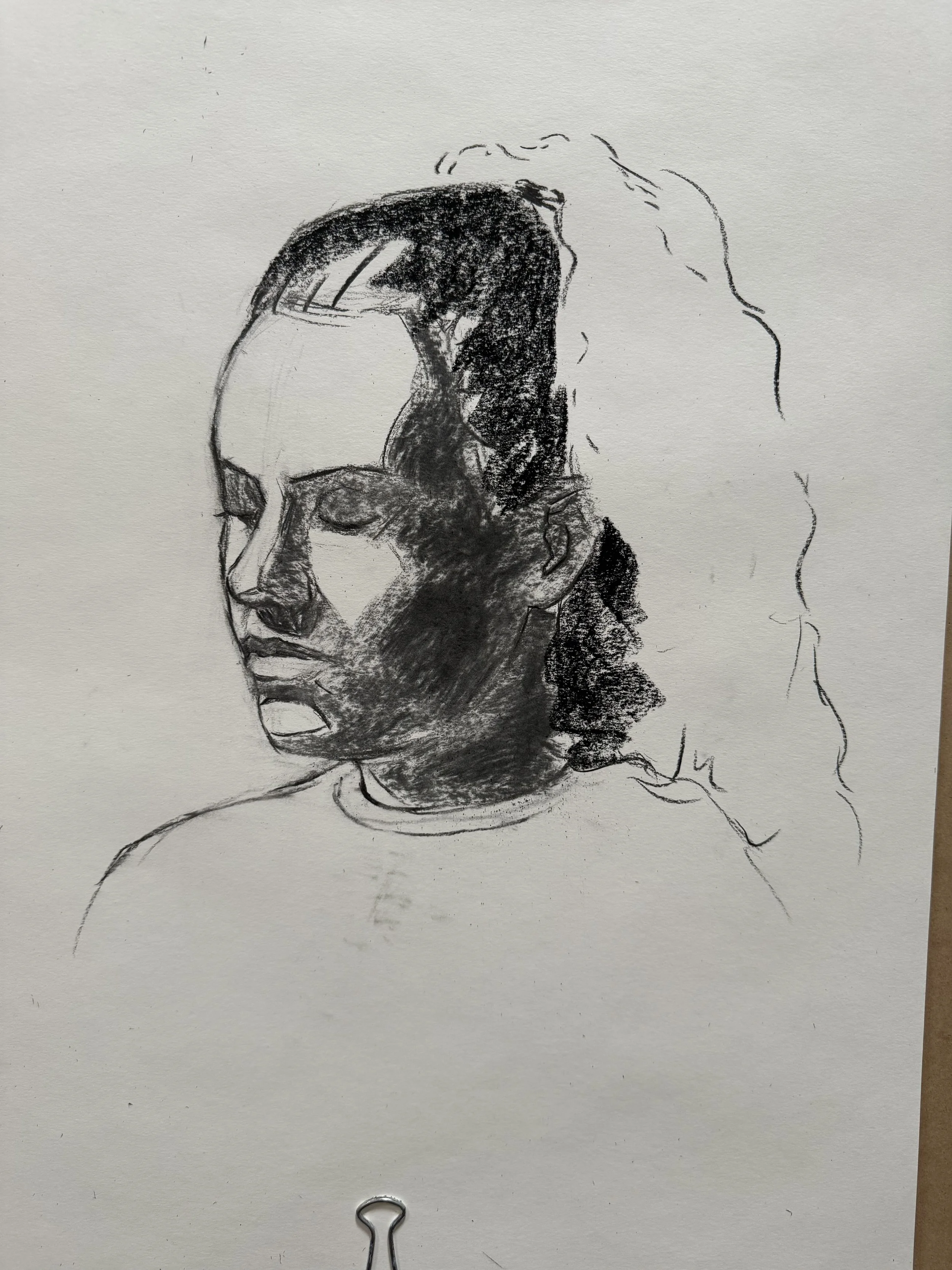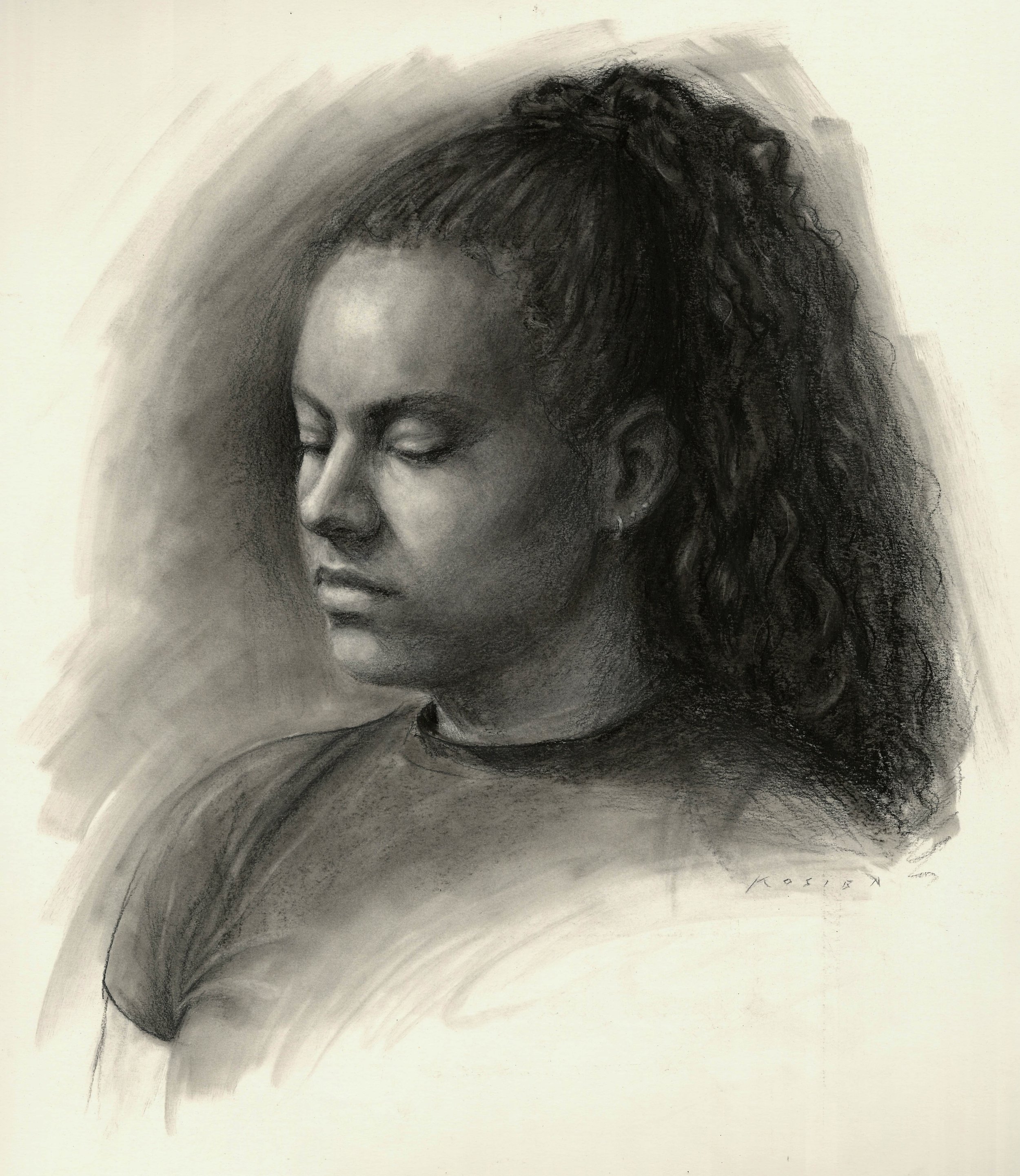 After studying this, I went back to my drawing and left the edges of her hair more unfinished and soft. I let the natural texture of the charcoal and paper show through. I gave the curls closest to her face some very soft definition, but still kept things loose and implied. I didn’t capture every curl, but my drawing is stronger for it.